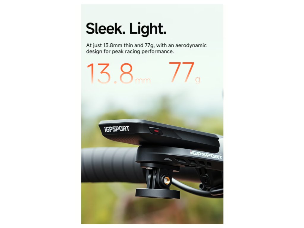 BiNavi Air kompaktní cyklo počítač, který přináší dokonalou rovnováhu mezi nízkou hmotností, dlouhou výdrží baterie a výkonnými funkcemi. S hmotností 77 g a tloušťkou 13,8 mm se jedná o štíhlé, ale robustní zařízení navržené pro náročné cyklisty.