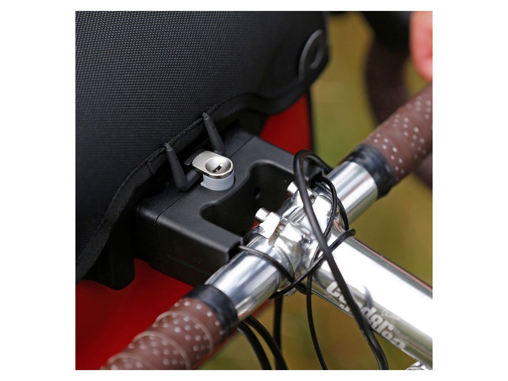Adaptér pro umístění řídítkové brašny na řídítka se zámkem. Vnitřní rozteč je 50 mm.