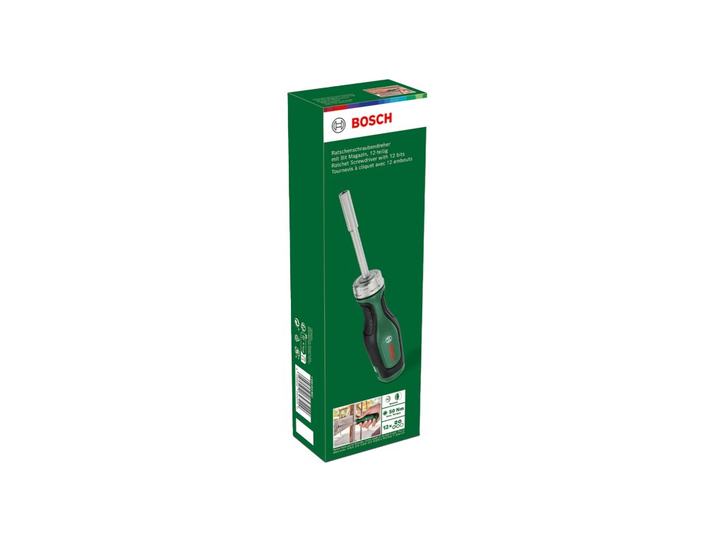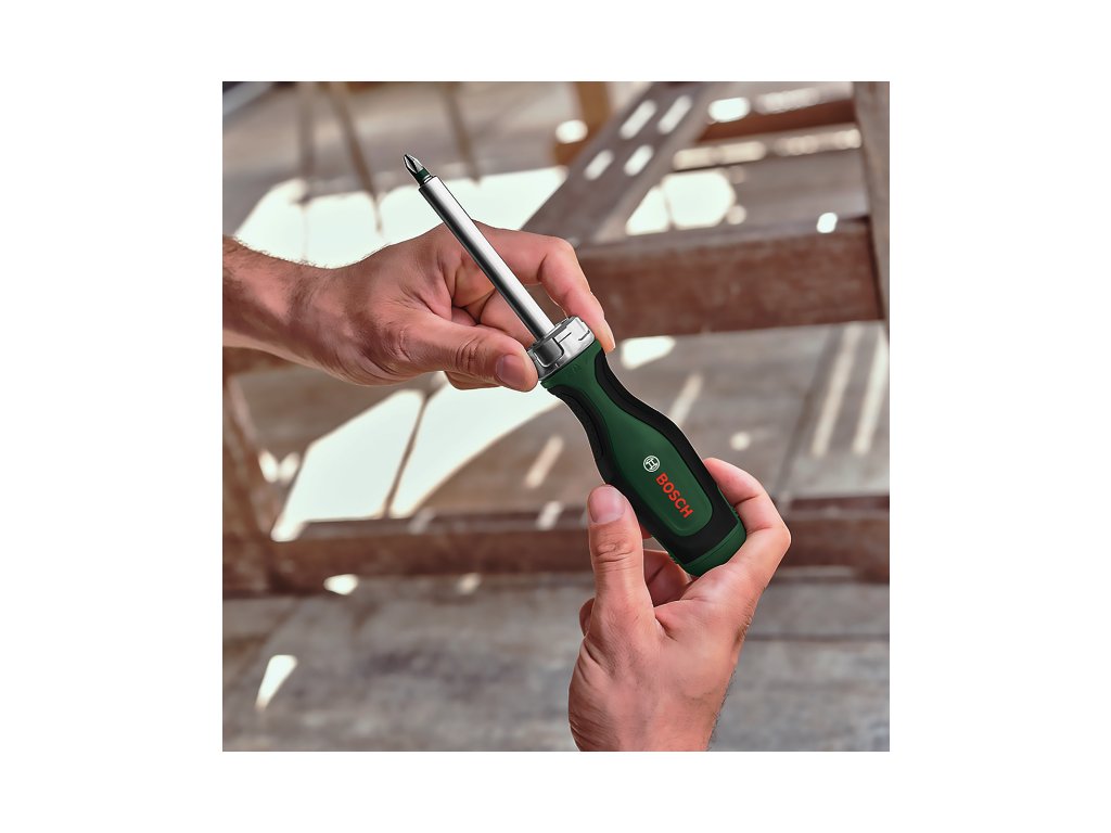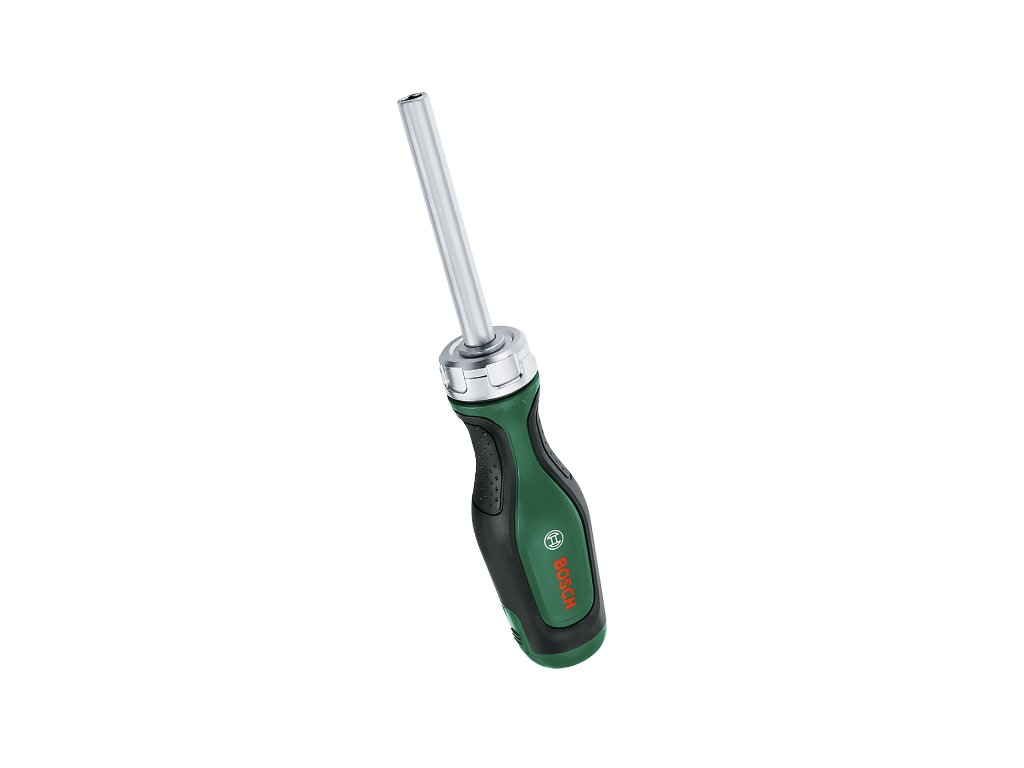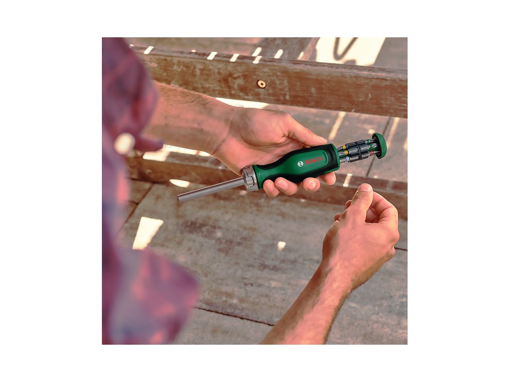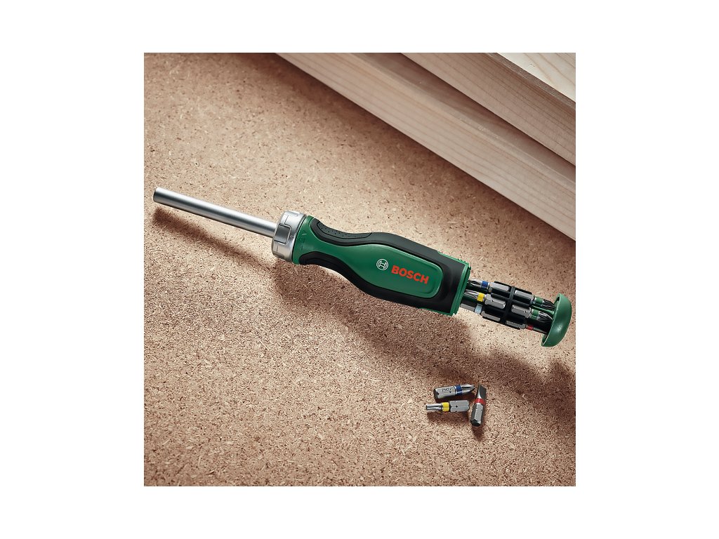 - 1x Krátký ráčnový šroubovák se 12 bity (PH, PZ, SL, TX, HEX)